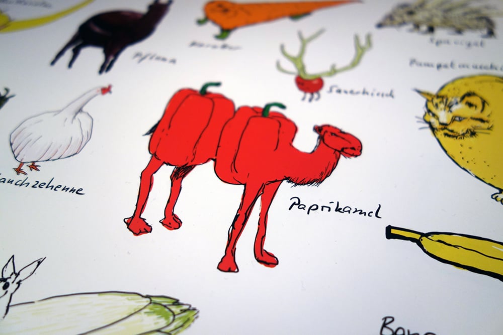 Gemüse ja! Aber auch Obst! Und Tiere! Hauptsache vegetarisch bzw. vegetierisch: Die "Vom Schälen und Dünsten stark bedrohte Tierarten" - besser bekannt als "Die Gemüsetiere" erfreuen sich großer Beliebtheit. Das Wortspiel-Tierposter mit Apfelefant, Orange-Utan, Karotter & Co ist ein richtiger Bestseller.